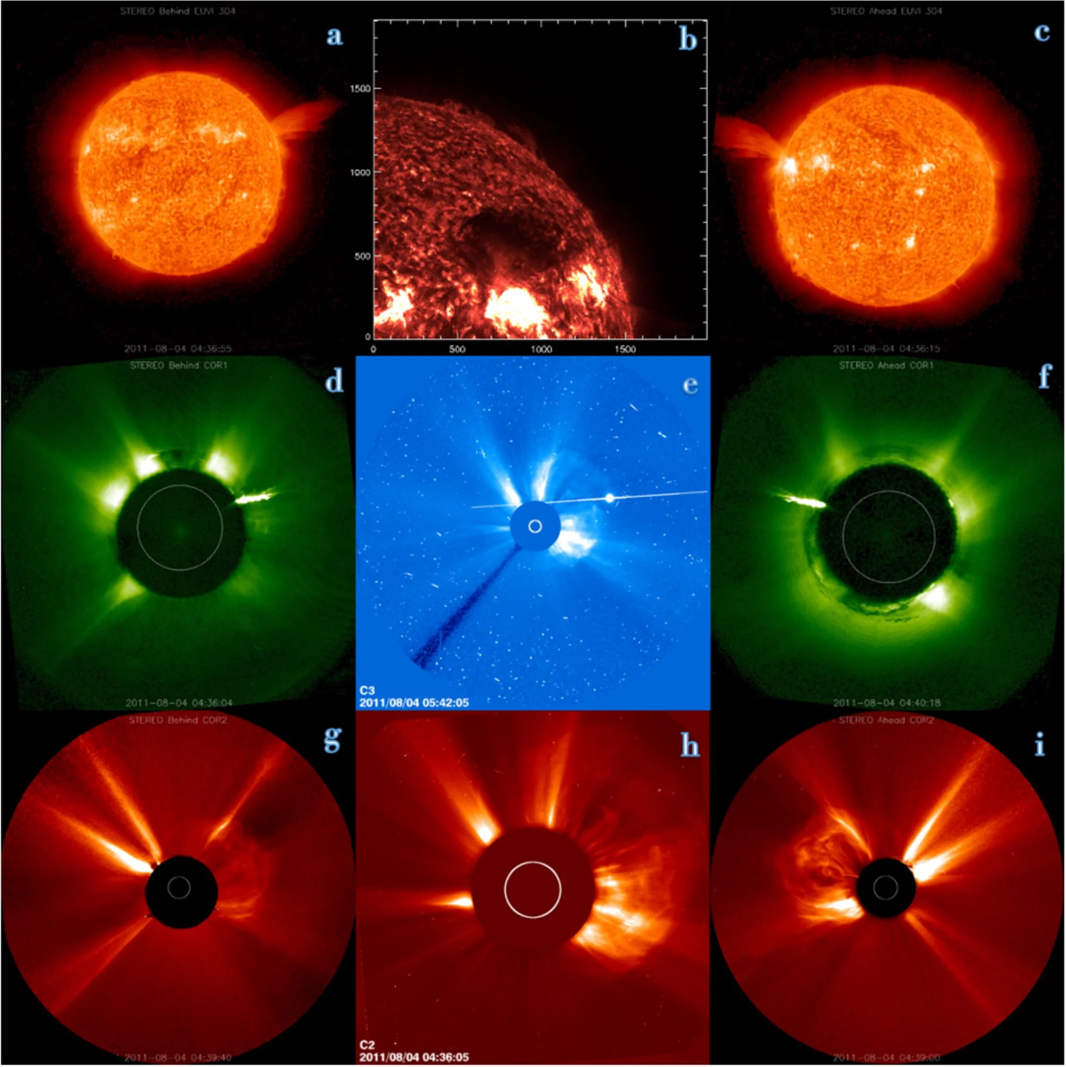 Multi-instrument observations of an Interplanetary Coronal Mass Ejection disturbance detected in situ by ACE/SWICS at 17:51 UT, 2011 August 5 (a) STEREO B/EUVI 304 Å; (b) SDO/AIA 304 Å; (c) STEREO A/EUVI 304 Å; (d) STEREO B/COR1; (e) LASCO/C3; (f) STEREO A/COR1; (g) STEREO B/COR2; (h) LASCO/C2; (i) STEREO A/COR2. [Kocher et al. 2018]